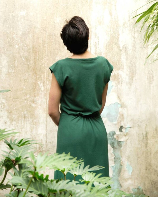 Jurk met licht uitgeschuinde rok en lichte watervaldecolleté.